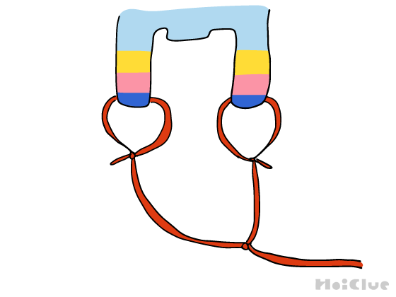 ・持ち手を握るのが難しそうであれば、毛糸の先に輪ゴムをつけたり、イラストのようにトイレットペーパーの芯などに結び付けるなどアレンジしてみる。